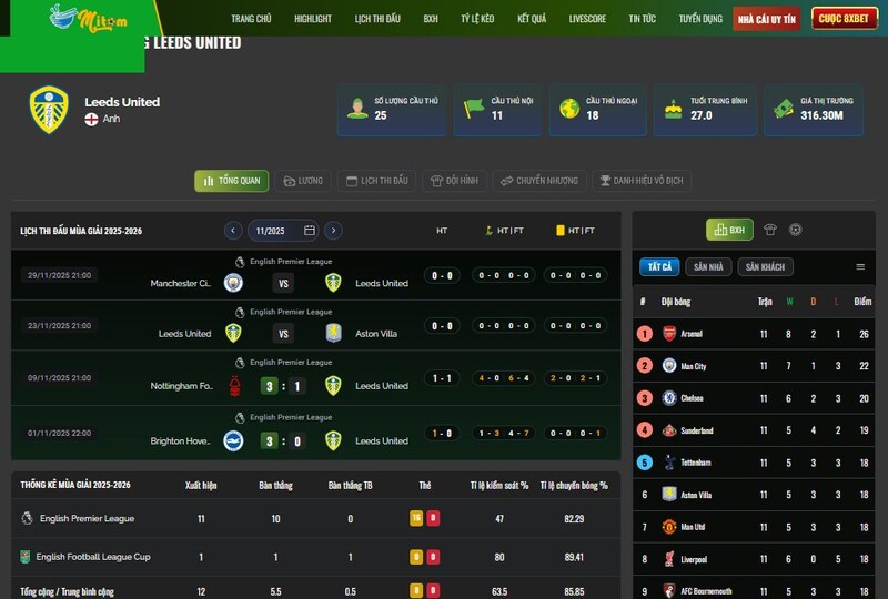 Ví dụ, Brentford, Everton hay Leeds United – những đội đang “giãy giụa” ở cuối bảng – được hiển thị chi tiết, không mờ nhạt như ở một số bảng xếp hạng khác. Điều này không chỉ để biết, mà còn giúp dự đoán các vòng đấu tiếp theo và xác định những trận “sinh tử” trong mùa giải.