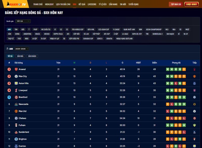 Với bảng xếp hạng bóng đá Ngoại Hạng Anh trên Rakhoi TV, mình có thể theo dõi sát từng vòng: