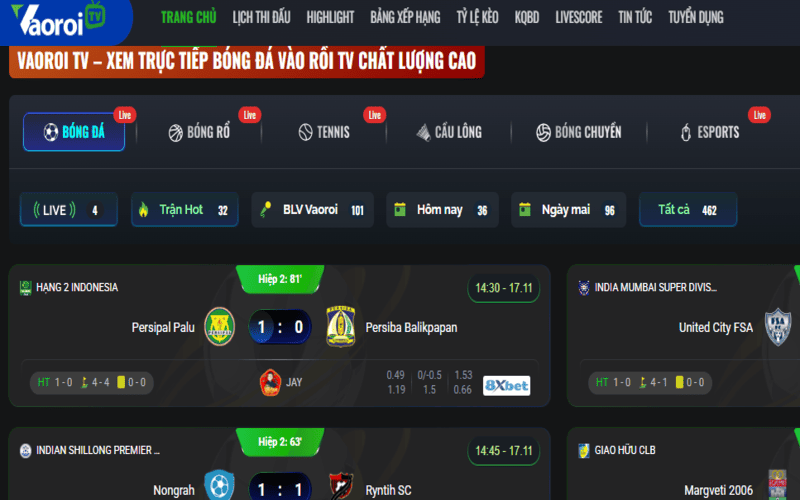 Một trong những ưu điểm lớn nhất của Vaoroi TV chính là mục lịch thi đấu được thiết kế rõ ràng, trực quan và dễ theo dõi. Người dùng chỉ cần truy cập vào trang chủ là có thể xem ngay các trận đấu nổi bật trong ngày, bao gồm giờ thi đấu, tên giải đấu, thông tin trọng tài, địa điểm diễn ra và thậm chí là các thống kê liên quan. Điều này giúp fan bóng đá tiết kiệm rất nhiều thời gian khi không phải tìm kiếm từng trận đấu ở nhiều website khác nhau.
